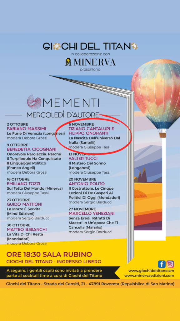 Presentazione del libro all’interno di “Mementi – Mercoledì d’autore”, una rassegna (ad ingresso gratuito) di autori prestigiosi che presenteranno le loro opere ogni mercoledì dal 2 ottobre al 27 novembre 2024. È un evento di Giochi del Titano, in collaborazione con Edizioni Minerva.